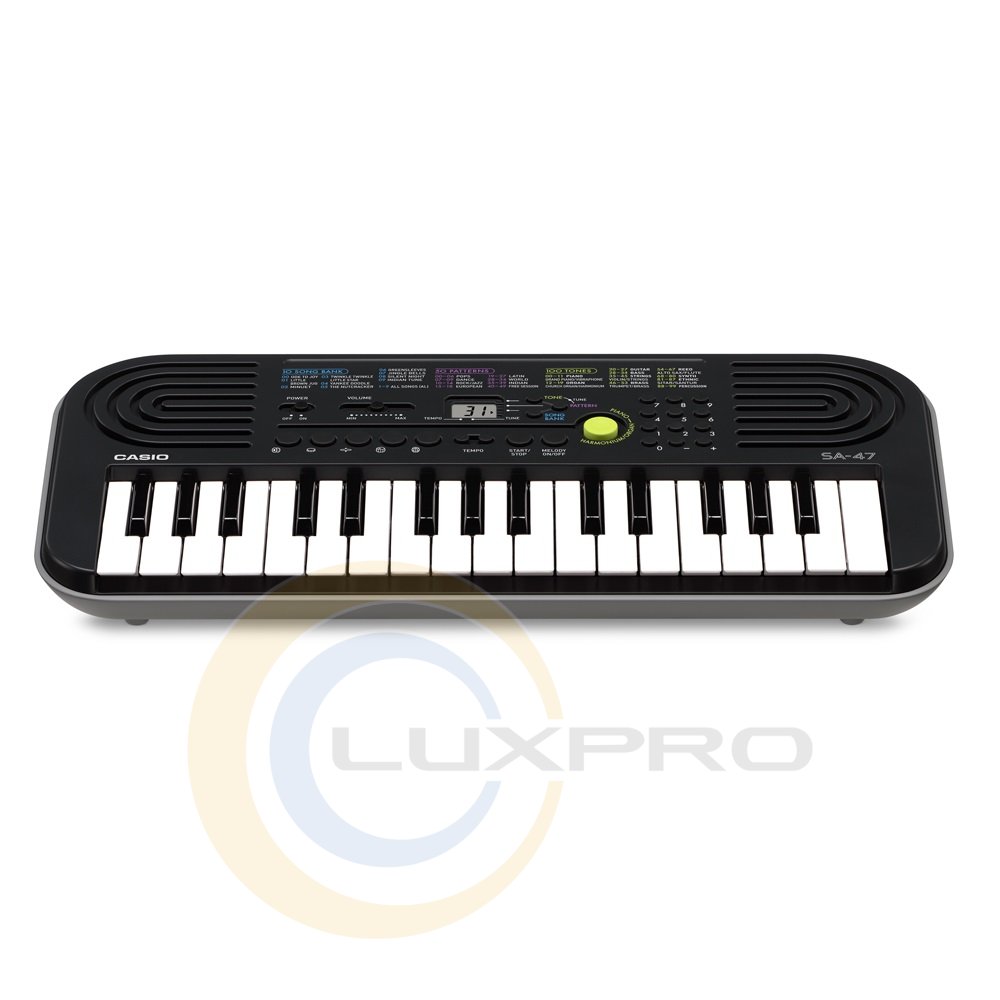 Клавішник цифровий CASIO SA-47AH7 незважаючи на малий розмір і всього лише 32 клавіші, це не просто іграшки, а повноцінні музичні інструменти для початківців. По-перше, в ньому присутні солідна 8-ми нотна поліфонія і прекрасне звучання всіх 100 вбудованих тембрів і 50 стилів. А по-друге, міні клавіатура цього синтезатора відмінно підходить для дитячих пальчиків. Також в моделі є LC дисплей, винесені на корпус кнопки ударних інструментів і спеціальна кнопка для швидкого перемикання між фортепіано і органом.