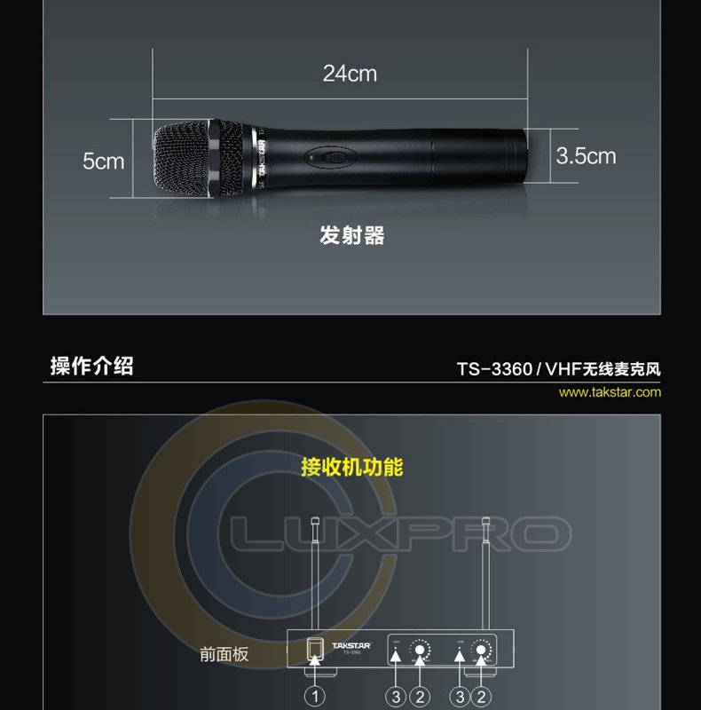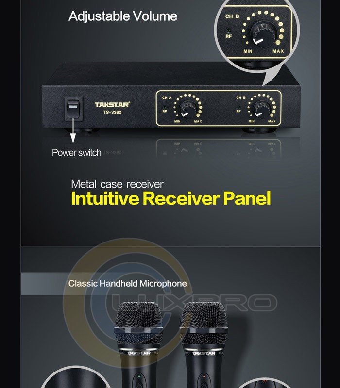 Радіосистема Takstar TS-3360 зручна бездротова мікрофонна система з двома ручними мікрофонами, управління шумозаглушенням і девіація частоти: 15 кГц. Частотний діапазон: 60 Гц-15 кГц.