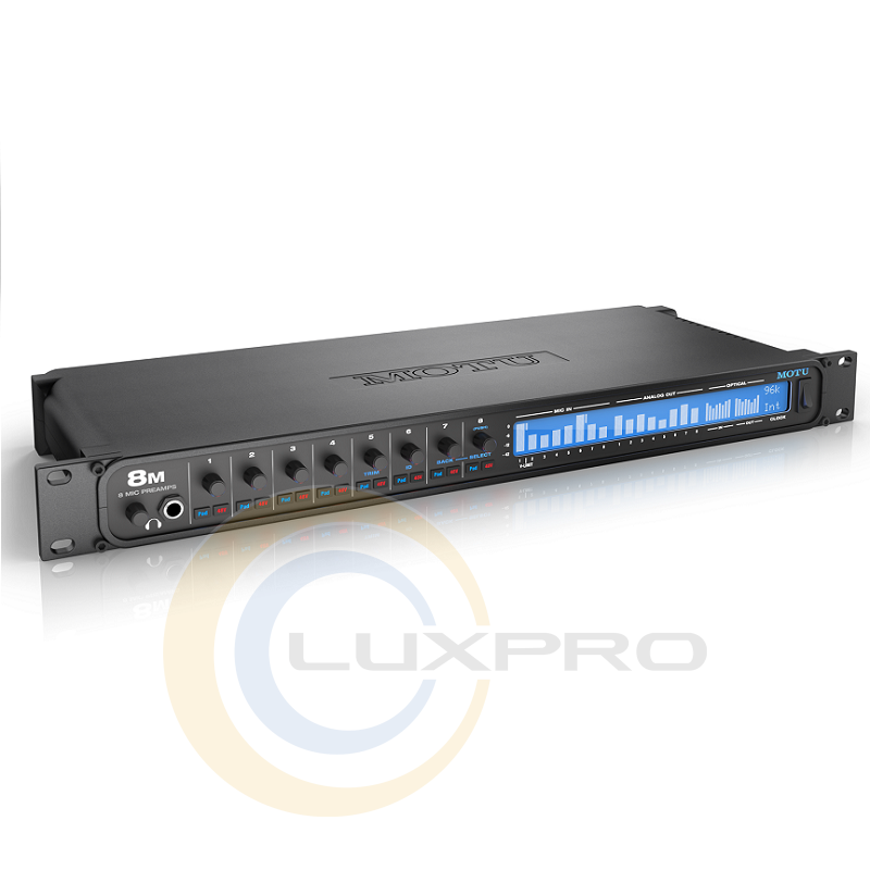 MOTU 8M - аудіоінтерфейс, серії AVB з Thunderbolt надають широкий спектр аналогових і цифрових входів / виходів, ЦАП / АЦП з широким динамічним діапазоном і 48-канальний мікшування. Крім того, не можна не відзначити DSP-ефекти і універсальне підключення до комп'ютера. Користувач зможе розширити систему за допомогою Ethernet мережі, а за допомогою комутатора MOTU AVB Switch можна об'єднати до 5 звукових інтерфейсів AVB.