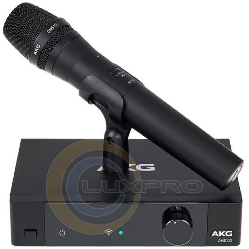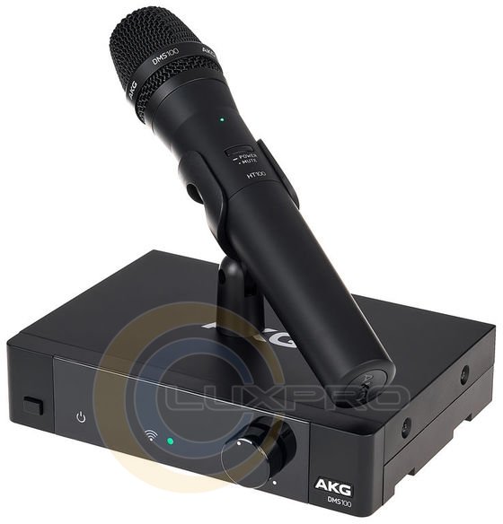 AKG DMS100 Vocal Set - радіосистема, цифрова радіосистема з ручним передавачем з динамічним капсулем P5, діапазон 2,4 ГГц, 4 канали. DMS100 Vocal Set - це цифрова радіосистема для вокалу і презентацій. Вона складається з бездротового мікрофона і приймача. Система зареєстрована по всьому світу і безкоштовна, оскільки працює в діапазоні частот 2,4 ГГц. Завдяки незжатої 24-бітної / 48 кГц радіопередачі якість звуку незмінно високу. Щоб захистити конфіденційну контент, сигнал шифрується під час передачі.
