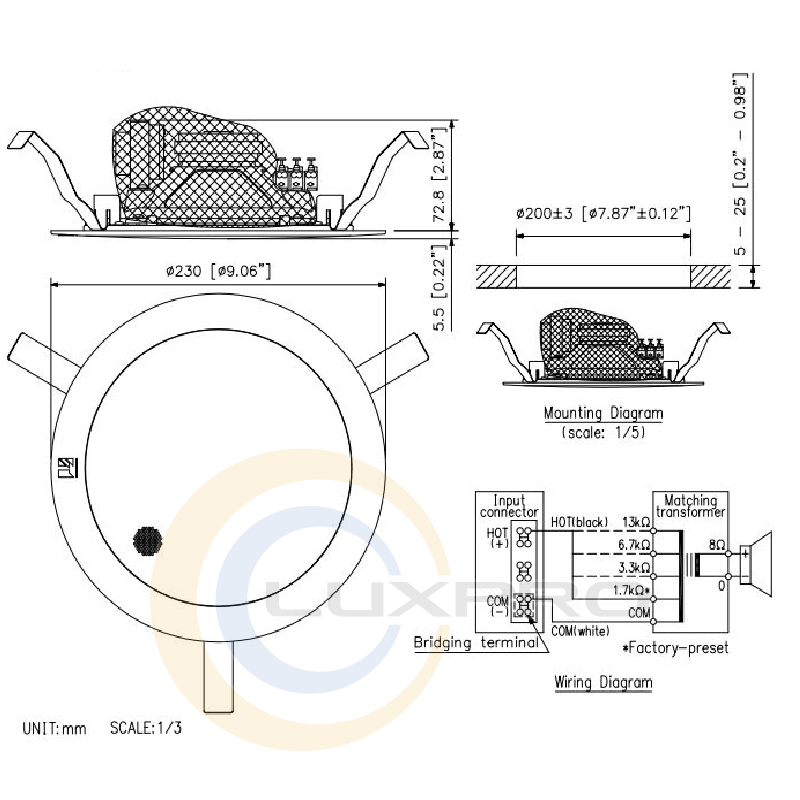 У конструкції присутні затискні клеми, які дозволяють створити мостове з'єднання при такій необхідності. Монтаж гучномовця не викличе ніяких складнощів за рахунок пружинних затискачів. Екран виконаний з високоякісний стали і має куполоподібну форму.6