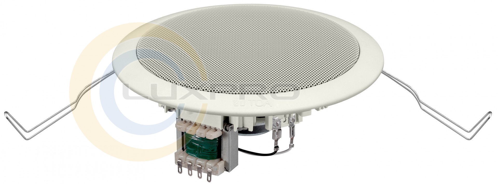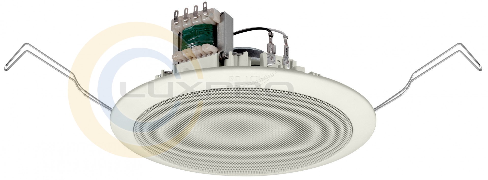 Потужний невеликого розміру підвісний гучномовець спеціального дизайну для тонких стельових панелей. Дана модель швидка і проста в монтажі завдяки пружинним затискачів. Екран кремового кольору зроблений з PP-пластика, захищений декоративною SECC-сіткою кремового кольору. Затискні клеми мають можливість мостового з'єднання.