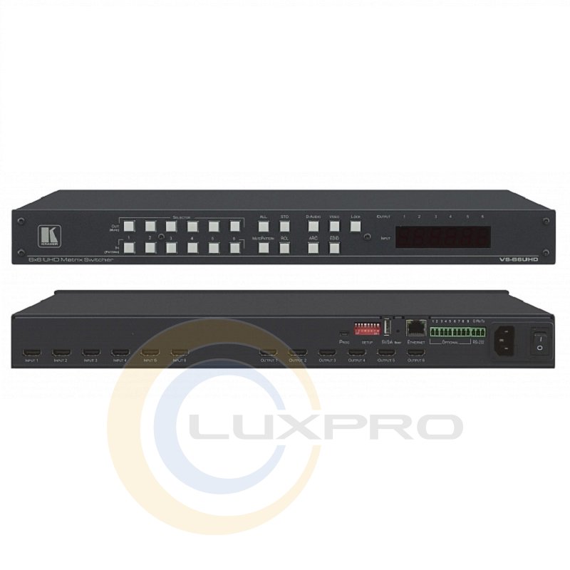 VS-66UHD - матричний комутатор 6х6 сигналів HDMI здатністю до 4K @ 60Hz (4: 2: 0) і вбудованих цифрових аудіосигналів. Прилад виконує перетактірованіе вхідного сигналу і компенсацію АЧХ кабелю, після чого розподіляє сигнал на один або кілька виходів одночасно, відповідаючи вимогам HDCP. VS-66UHD забезпечує незалежну матричну комутацію вбудованих в сигнал HDMI цифрових аудіосигналів, включаючи аудіосигнал в зворотних аудіоканали (ARC). При цьому сукупна розмірність матриці аудіосигналів становить 12х9.