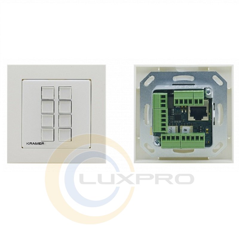 RC-208/EU-80/86(W) - компактна 8-кнопкова панель управління, одиночного типорозміру в варіантах виконання EU, UK і US. Проста в установці панель RC-208 відповідає естетичним вимогам дизайну робочих приміщень і прекрасно підходить для використання в якості кнопкової панелі призначеного для користувача інтерфейсу управління в системі Kramer Control. За допомогою ПО Kramer K-Config можна отримати доступ до багатого набору інтерфейсів вводу / виводу, наявного в складі панелі RC-208, щоб використовувати її в якості окремого контролера приміщення.