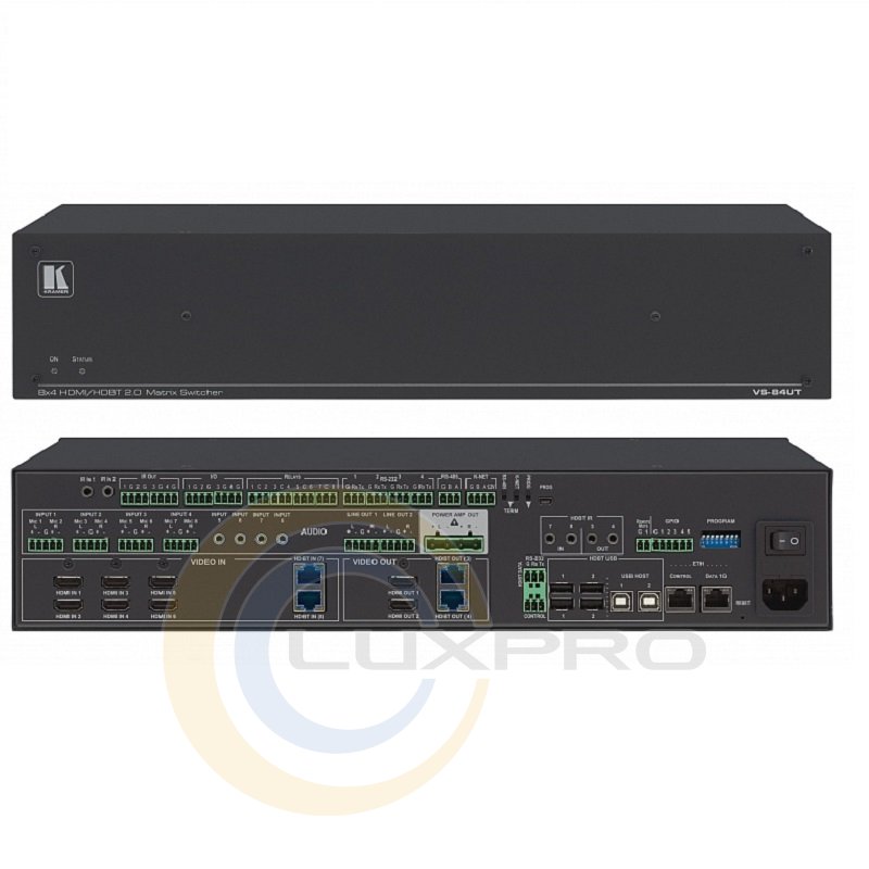 VS-84UT - матричний комутатор сигналів HDMI, HDBaseT 2.0, аналогового і цифрового аудіо з вбудованим контролером приміщення і підсилювачем потужності. Прилад здійснює комутацію відеосигналів з роздільною здатністю до 4K @ 60 Гц (4: 2: 0), а також аудіосигналів, забезпечує деембедірованіе і ембедірованіе аналогового аудіосигналу в вихідний сигнал HDMI і HDBaseT. VS-84UT забезпечує двосторонню передачу сигналів USB, ИК, RS-232 і даних Ethernet за єдиною лінії HDBaseT з харчуванням сумісних приймачів за технологією PоE. Вбудований підсилювач потужності дозволяє відтворювати вихідний аудіосигнал безпосередньо на підключених гучномовцях.