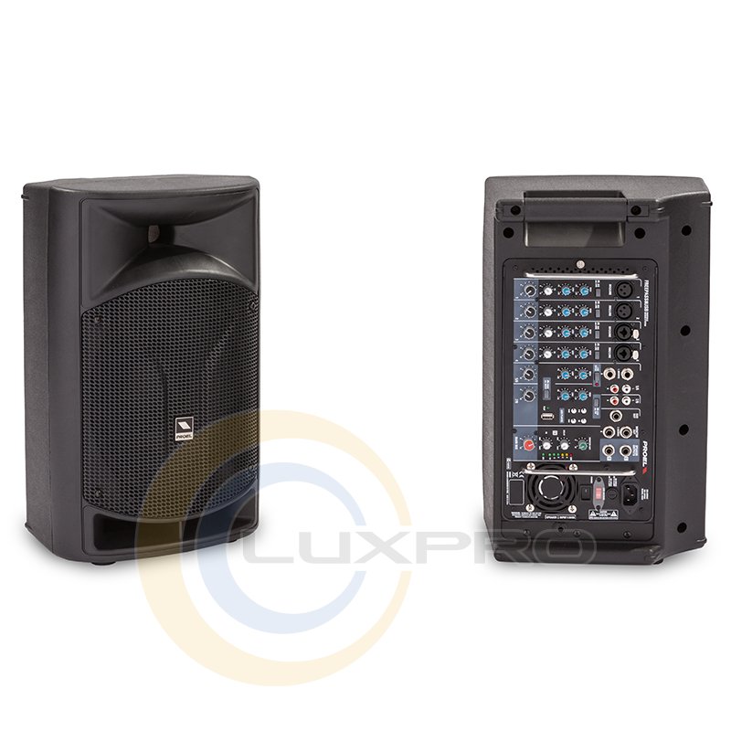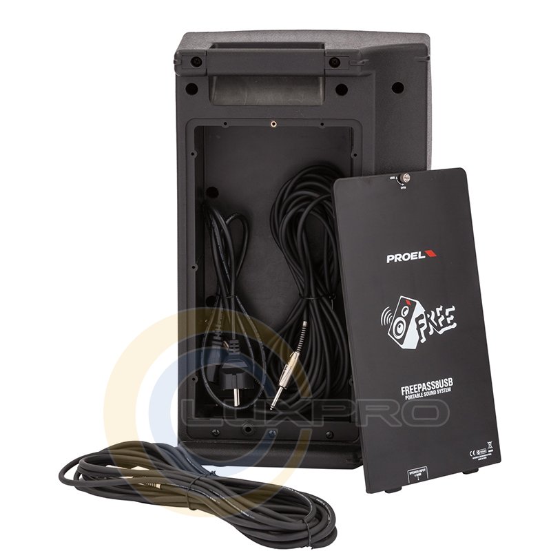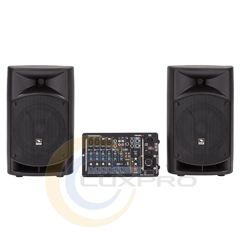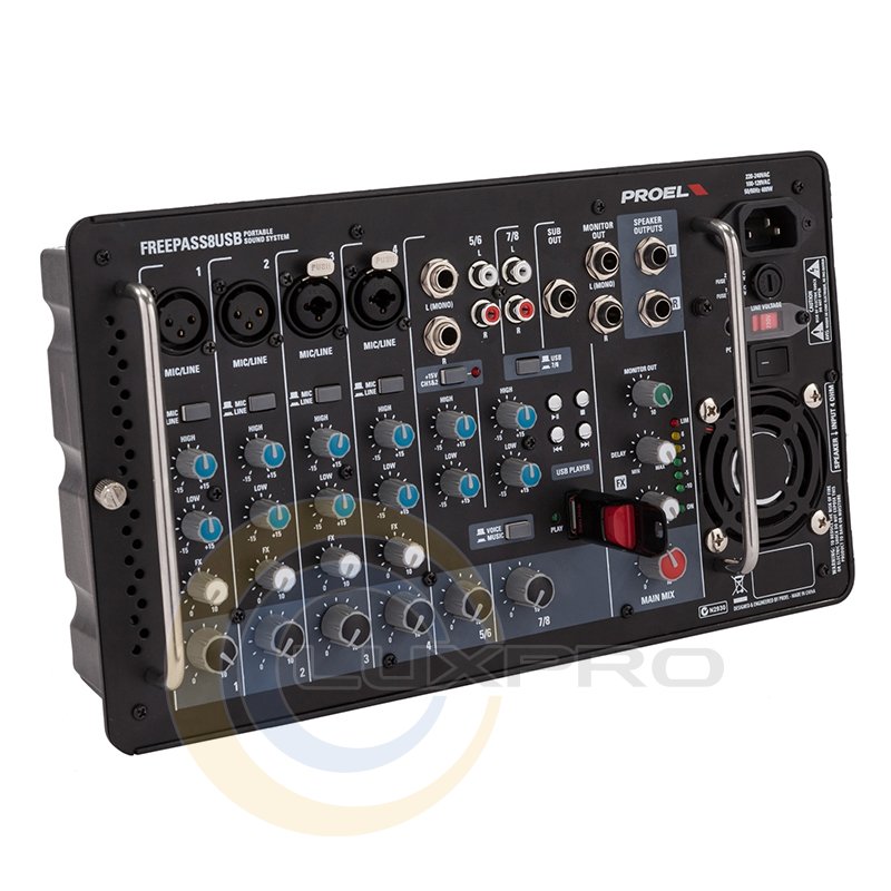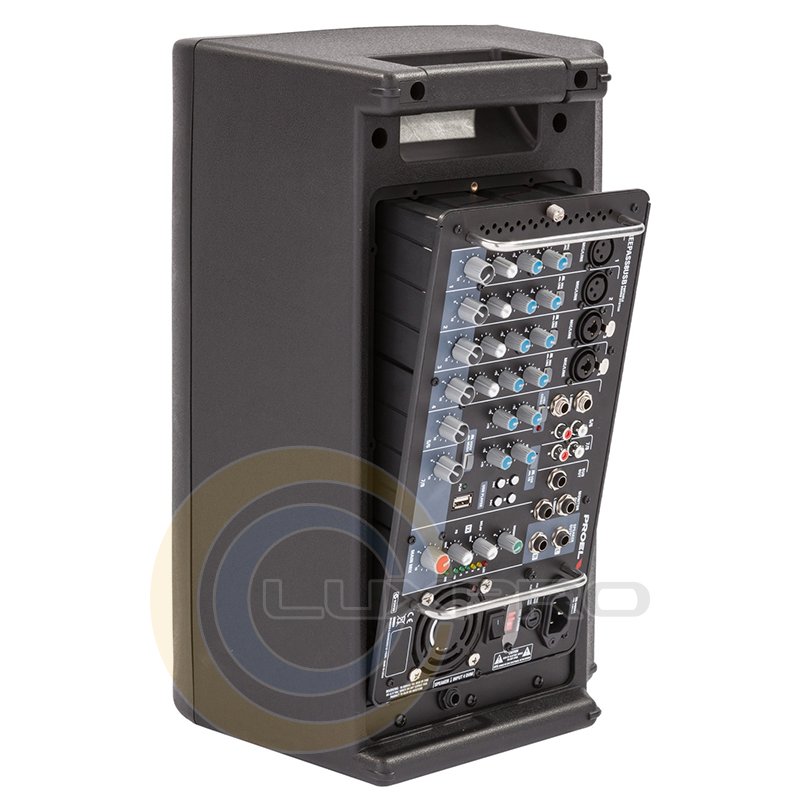 8-канальний мікшер потужністю 2x250 Вт ідеально підходить для одного з двох гучномовців, і його можна використовувати як є, так і окремо за допомогою простого управління. Другий динамік включає в себе зручний і великий відсік, який може містити всі сполучні кабелі та інші аксесуари. Також є два високоякісних акустичних кабелю PROEL з надміцним 1/4" металевими роз'ємами.