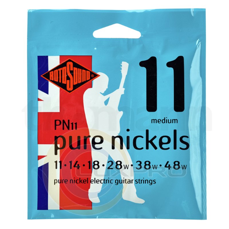 Rotosound Pure Nickel струни для електрогітари, нікелеве покриття, 11-48. Кращі в топовом розділі струн для електрогітари комплекти з чистого нікелю з чудовими магнітними характеристиками, винятковим магнітним відгуком, об'ємом, чіткістю і тоном. Це дійсно елітні гітарні струни! Примітка: для позначення струн з обмоткою використовується символ "w". Струни такої товщини: 11, 14, 18, 28w, 38w, 48w.