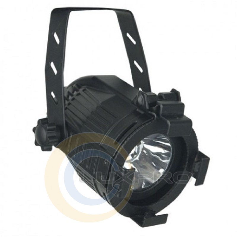 Світлодіодний LED прожектор LED Pinspot Pro Black PAR 36 з концентрованим променем для локальної підсвічування, призначений для експлуатації в сухих, мало запилених, приміщеннях. Як джерело світла використовується світлодіод білого холодного світла. Охолодження природне. Харчування здійснюється від стандартної електромережі, кабель живлення 1.1 м. Корпус виконаний з литого під тиском алюмінію. Для розміщення світлофільтрів додається рамка. Для монтажу прожектора передбачена поворотна ліра.