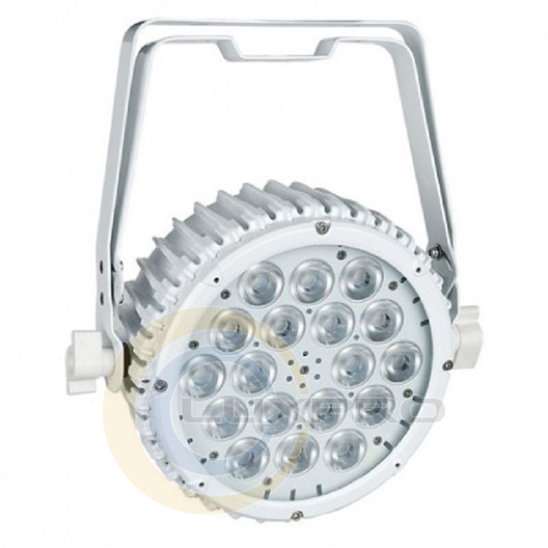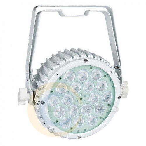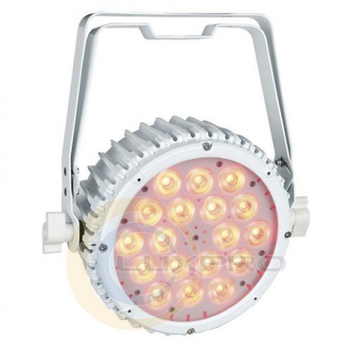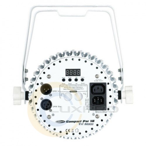 Світлодіодний LED прожектор Compact Par 18 Tri MKII White світла, що заливає, призначений для експлуатації в сухих, мало запилених приміщеннях. Як джерело світла використовуються 18 RGB мультічіпов 3-в-1. Мерехтіння відсутня. Управління гнучке. Можливо зовнішнє по протоколу DMX512, для чого на тильній поверхні передбачені пара роз'ємів XLR 3-pin (вхід і вихід). Для безпосереднього управління там же є LED дисплей і кнопки меню.