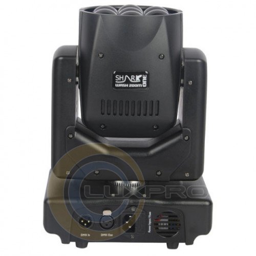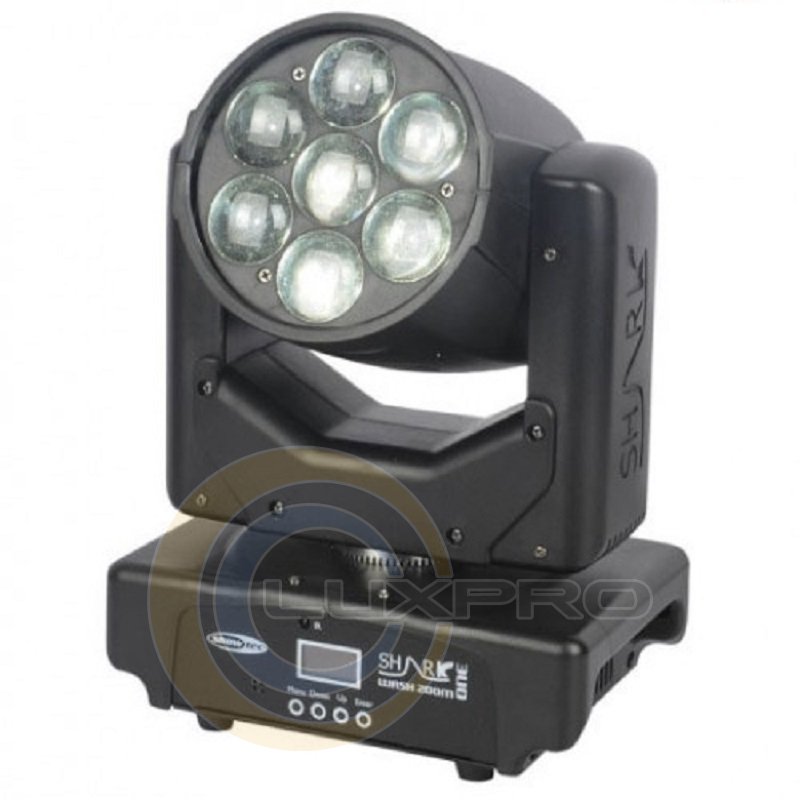 Shark Zoom Wash One - світлодіодна LED голова, комбінованого світла з дистанційно коректованим кутом розкриття променя, призначена для експлуатації в сухих, помірно запилених, приміщень. Як джерело світла використовуються 7 RGBW 4-в-1 мультічіпов. Для управління, в тому числі, використовується протокол DMX512, передбачені роз'єми управління XLR 3-pin (вхід і вихід). Також передбачено дистанційне керування за допомогою ІК пульта дистанційного керування (додається).