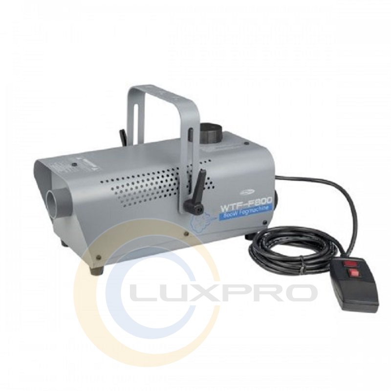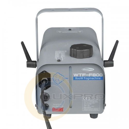 WTF-F800 800W Fogger - генератор диму, з енергійним вихлопом і контролем щільності середовища. Призначена для використання виключно в приміщеннях. Передбачено дистанційне ручне управління (фіксований кабель 2,9 м). Харчування від стандартної електромережі, фіксований кабель 1,7 м з вилкою Schuko. Банку для рідини знімна. Корпус виконаний з металу і вогнетривкого пластику. Для установки є поворотна ліра.