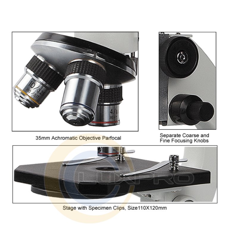 Підсвітка цього мікроскопа може живитися як від мережі, так і від вбудованого акумулятора. Ця перевага, разом з обертовою окулярною насадкою (і справедливою ціною) робить ідеальним мікроскопом для шкільних кабінетів біології: таку модель можна поставити на кожну парту.