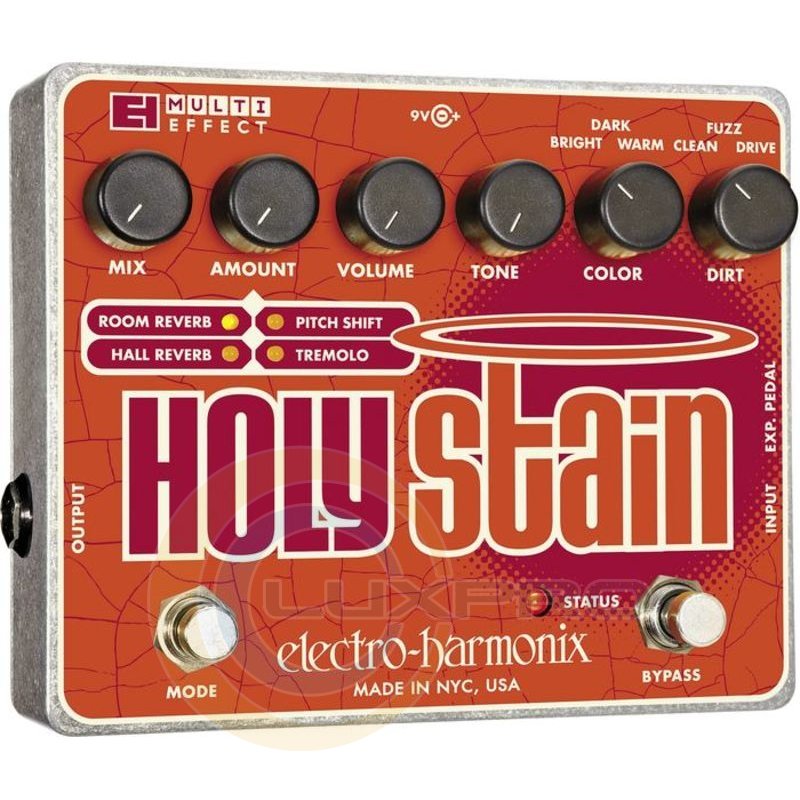 Holy Stain - педаль ефектів, яка поєднує в собі 4 ефекти: Distortion, Reverb, Pitch, Tremolo. Педаль має 6 регуляторів Mix, Amount, Volume, Tone, Color, Dirt. Педаль має 2 входи - один для інструменту, другий для педалі експресії, і 1 вихід. Так само гніздо для підключення блоку живлення. Педаль дозволяє підмішувати реверберацію, пітч-шіфтер і тримали до аналогових Drive і Fuzz ефектами (які також працюють у цій педалі) для досягнення неповторного звуку. Є три режими відтінку звучання: Bright / Dark / Warm.