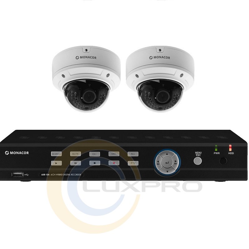 MONACOR AXZ-204DVM - камера, комплект відеоспостереження HYBRID Line, що складається з 4-канального цифрового відеореєстратора HYBRID Line AXR-104 і 2 кольорових камер HYBRID Line AXC-2812DVM.