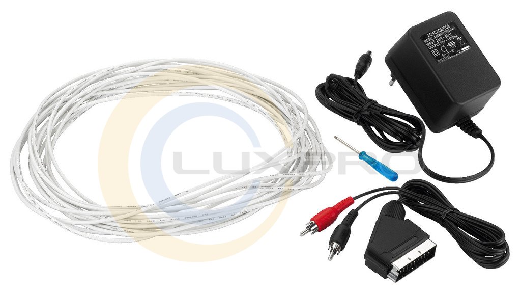 - Поставляється з 35-метрової петлевий дротом для настройки індукційного петлі, адаптером SCART, джерелом живлення.