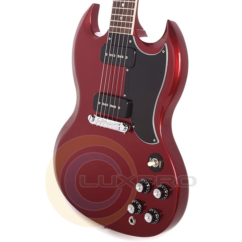 GIBSON SG SPECIAL VINTAGE SPARKLING BURGUNDY - електрогітара, яка повертає класику: увічнена Сантаною у Вудстоку і розбита на сцені Таунсенд, GIBSON SG є іконою року. Таким чином, SG SPECIAL, зроблена в Нешвіллі, повертає нас до епохи становлення легендарної електрогітари з декою з махагоні, зручним профілем грифа Slim Taper, накладкою з палісандра, звукознімачами P-90 і вінтажною обробкою.
