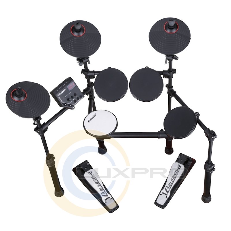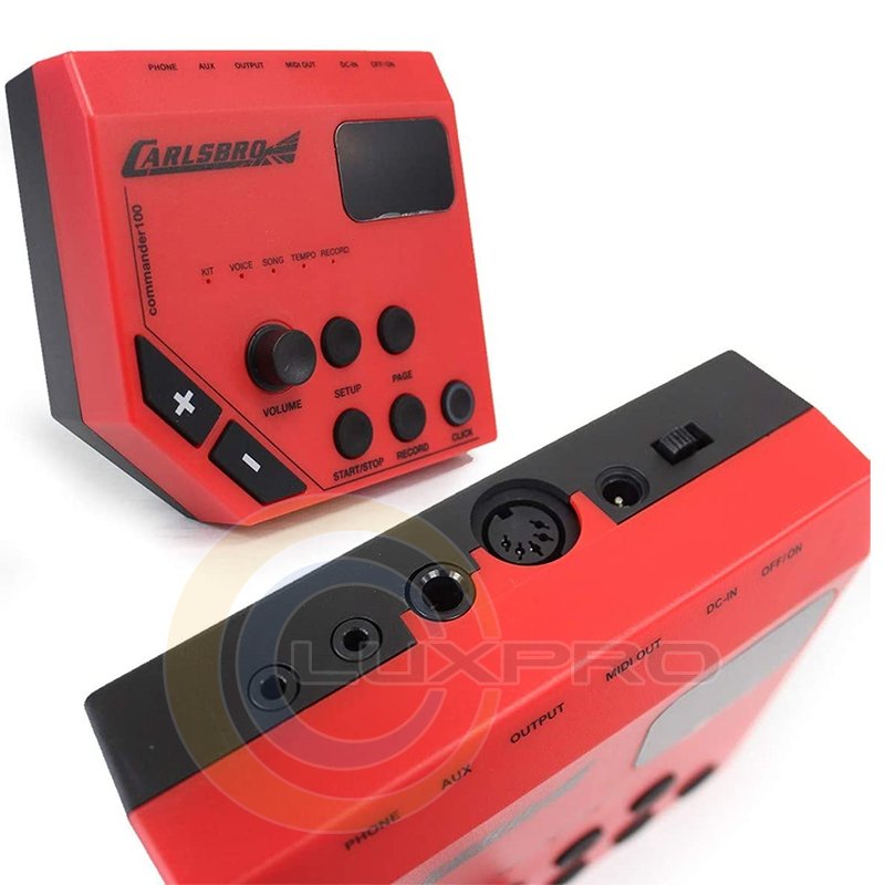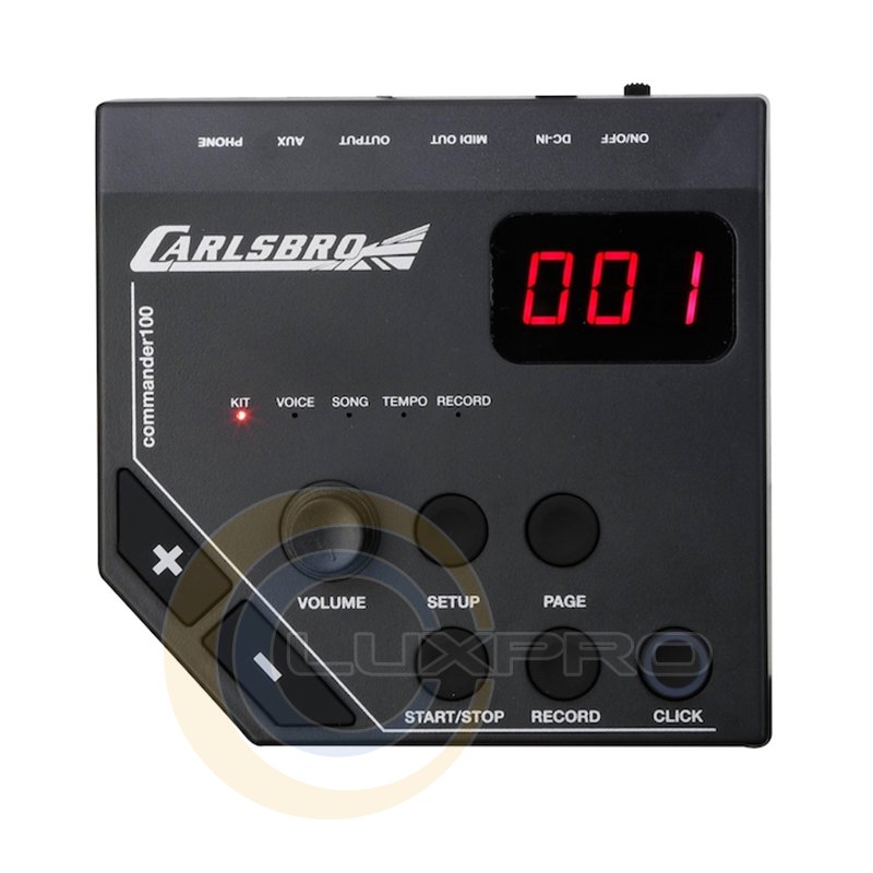 CARLSBRO CSD100 - електронна ударна установка, звуковий модуль Commander 100, 108 звуків, 10 пресетів-установок, 10 демо-пісень, 4 педа, aux-вхід 3.5 мм, лінійний вихід, вихід на навушники, міді-вихід, можливість запису і плейбек, метроном.