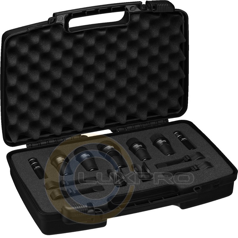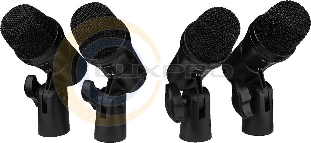 Набір мікрофонів DRUMSET-1, що складається з динамічного мікрофона з бас-барабаном, чотирьох динамічних мікрофонів з малим барабаном / тому-томи і двох конденсаторних мікрофонів, встановлених зверху.