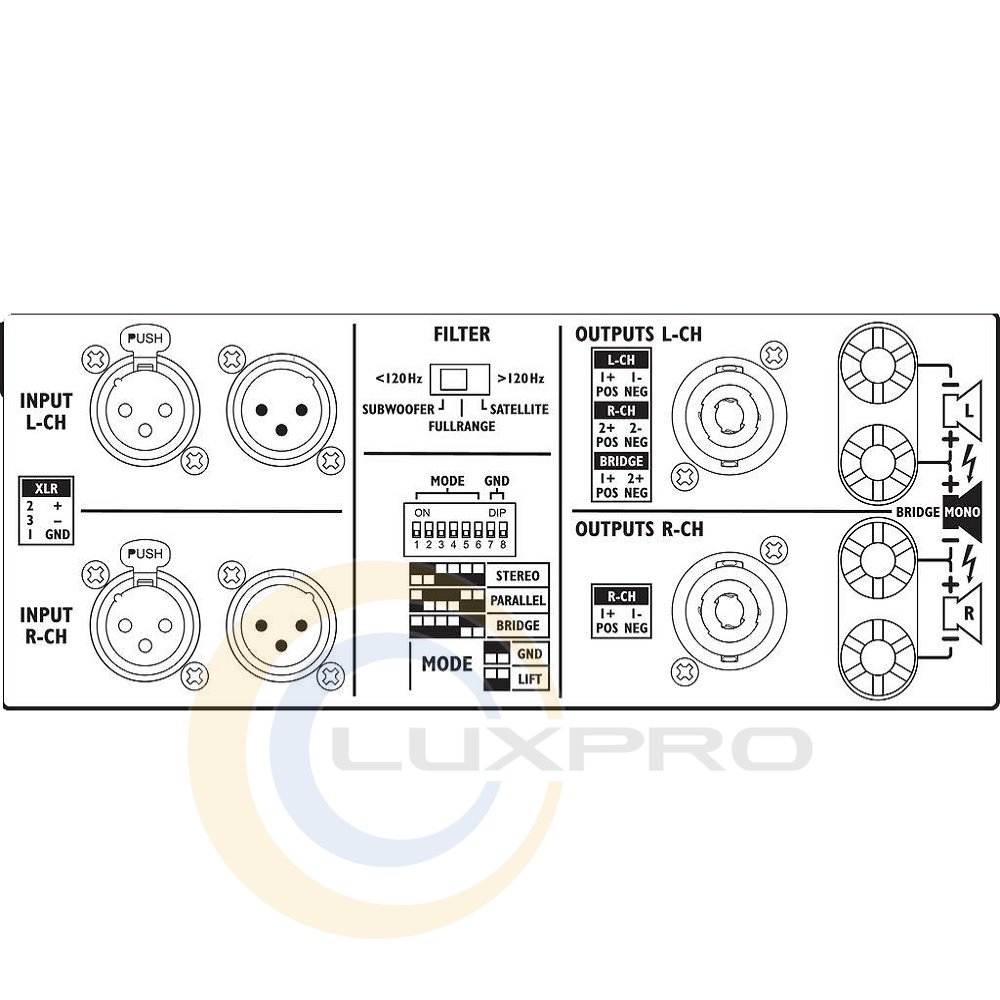 - вих. потужність (RMS, 1 кГц, 0.1% THD) - 2х700 Вт / 8 Ом, 2х1100 Вт / 4 Ом, 2х750 Вт / 2 Ом, 2000. Вт / 8 Ом (міст), 1500 Вт / 4 Ом (міст);