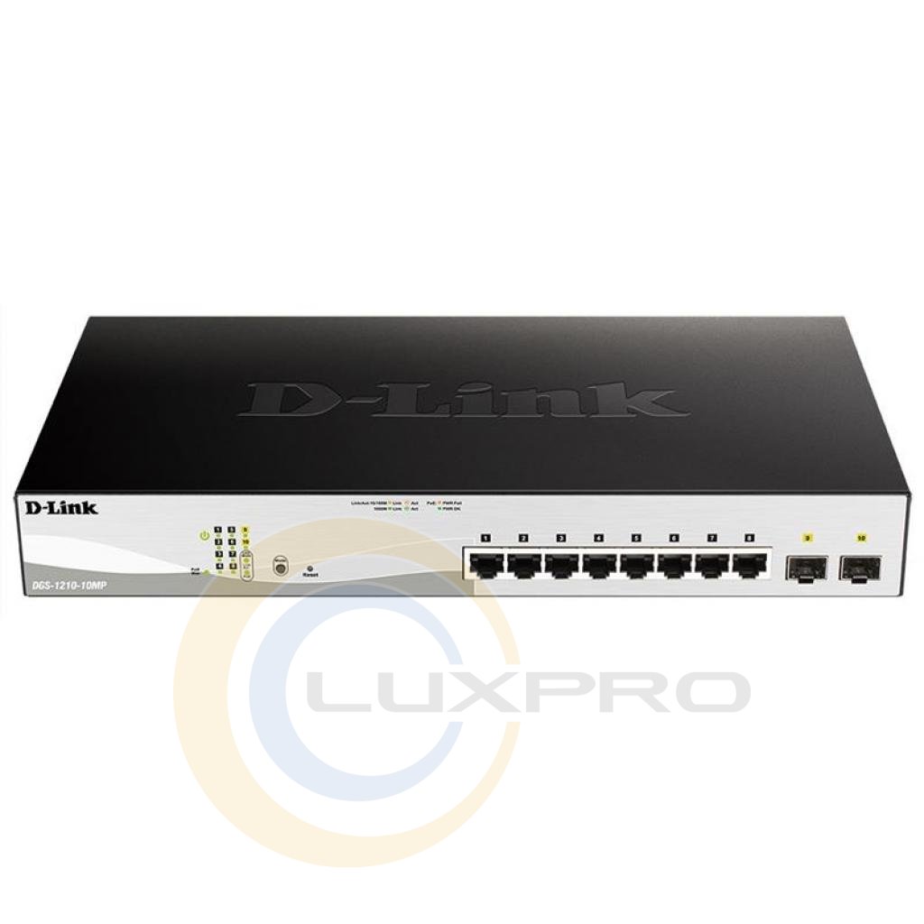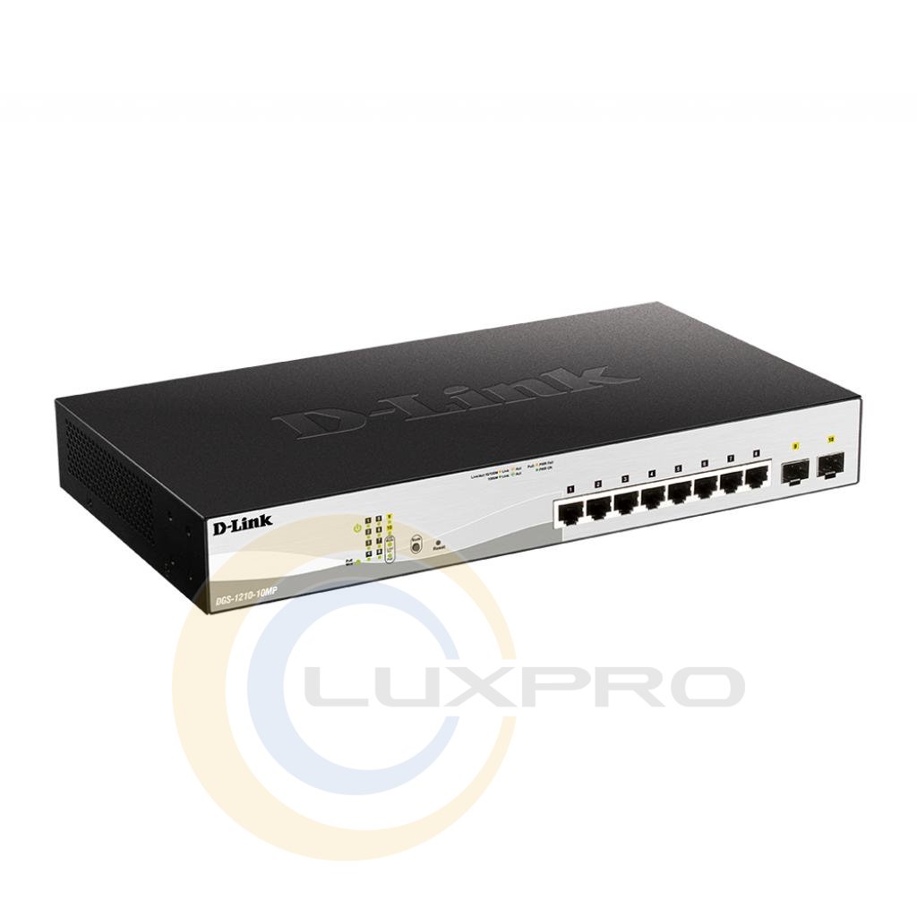 Комутатор серії WebSmart DGS-1210-10MP, оснащений 8 портами 10/100 / 1000Base-T з підтримкою PoE і 2 портами 1000Base-X SFP, підтримує технологію D-Link Green і розширені функції управління і безпеки, забезпечуючи високу продуктивність і масштабування мережі . Функції управління включають SNMP, управління на основі Web-інтерфейсу, утиліту D-Link Network Assistant і спрощений інтерфейс командного рядка (CLI) через Telnet. DGS-1210-10MP підтримує Auto Voice VLAN, забезпечуючи максимальний пріоритет для «голосового» трафіку. Даний комутатор оснащений пасивною системою охолодження, яка забезпечує безшумну роботу і дозволяє продовжити термін експлуатації пристрою