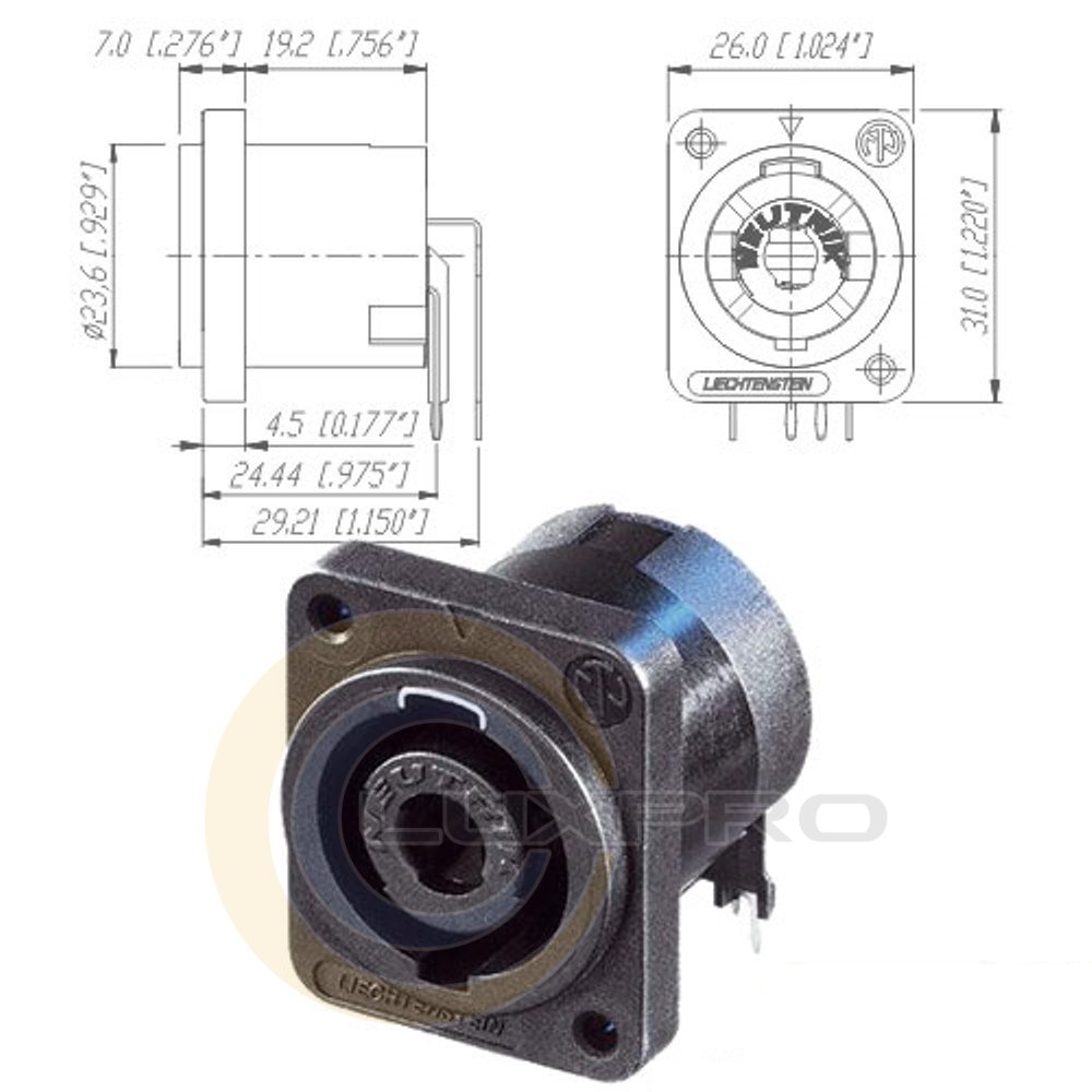 Стандартний панельний роз'єм SpeakON для установки в корпус на друковану плату акустичних систем і підсилювачів потужності. Роз'єм оснащений унікальною системою блокування з металевим фіксатором, що робить міцне зіткнення контактів при комутації. SpeakON роз'єм NL4MD-V надійний, універсальний і простий у використанні.Особливості: