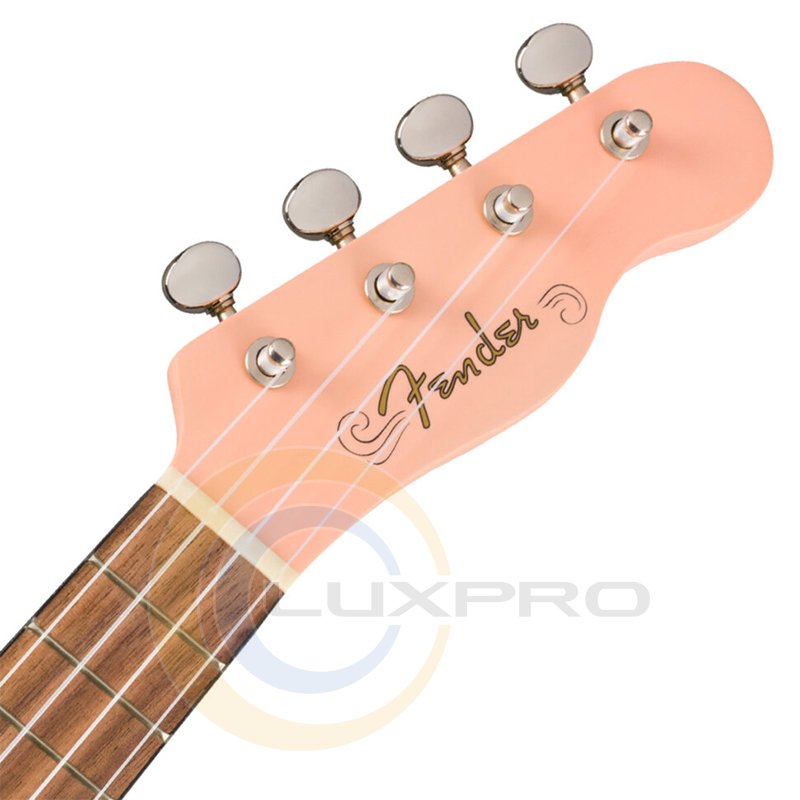 Гриф профілю Slim С виконаний з деревини нато з накладкою з горіха, він також дає додатковий комфорт при грі, а бридж No-Tie дозволяє легко та швидко змінювати струни. На грифі 12 ладів, мензура — 13.6" (345 мм). Укулеле має стильний зовнішній вигляд. Модель представлена у блакитному кольорі з хромованою фурнітурою. Корпус має матове оздоблення та кремове окантування. Голова грифа форми Tele 4-в-ряд дозволяє безпомилково впізнати інструмент виробництва Fender.