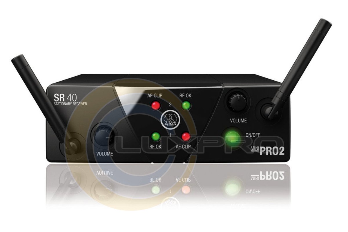 Що стосується бази (ресивера) SR 40 Mini 2: вона має 4 індикатори, що відображають статус для кожного з двох каналів радіосистеми. Індикатор RFOK показує рівень сигналу, AF Clip є індикатором обмежувача. Якщо на підсилювач надходить дуже сильний сигнал, лампочка індикатора загоряється. Також на базі присутній індикатор увімкнення/вимкнення радіосистеми і є дві ручки гучності, кожна з яких регулює вихідну гучність на своєму каналі. На зворотному боці ресивера є два балансних виходи на 1/4 jack (кожен вихід для свого окремого каналу). Блок живлення для бази додається до набору.