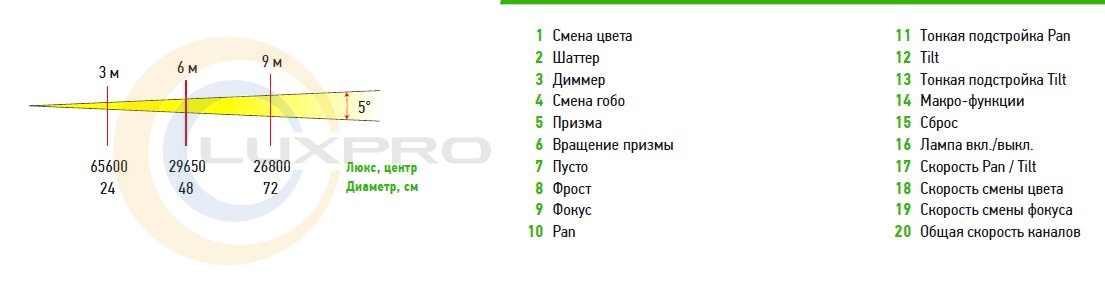 | Управління: | DMX, Master/Slave, Zoom, Автоматичний режим |