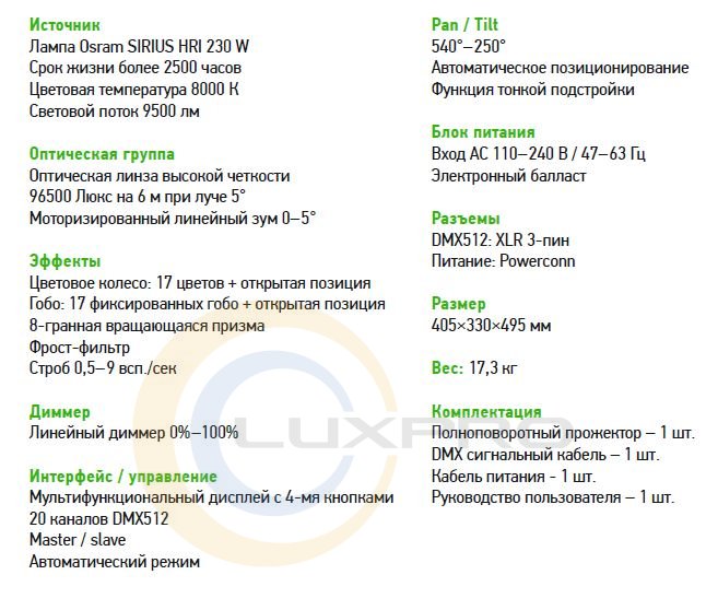 Прибор оснащен высококачественной оптикой, позволяющей получить освещенность более 6 500 Люкс на расстоянии 5 м, а также сформировать совершенно прямой луч, с углом раскрытия 0°. Функционал прибора включает в себя смену цвета, гобо, 8-гранную призму, фрост-фильтр и т. д.В ассортименте предлагается Кейс для 2-х LUX BEAM S230 - цена 2400 грн. за 1 шт.