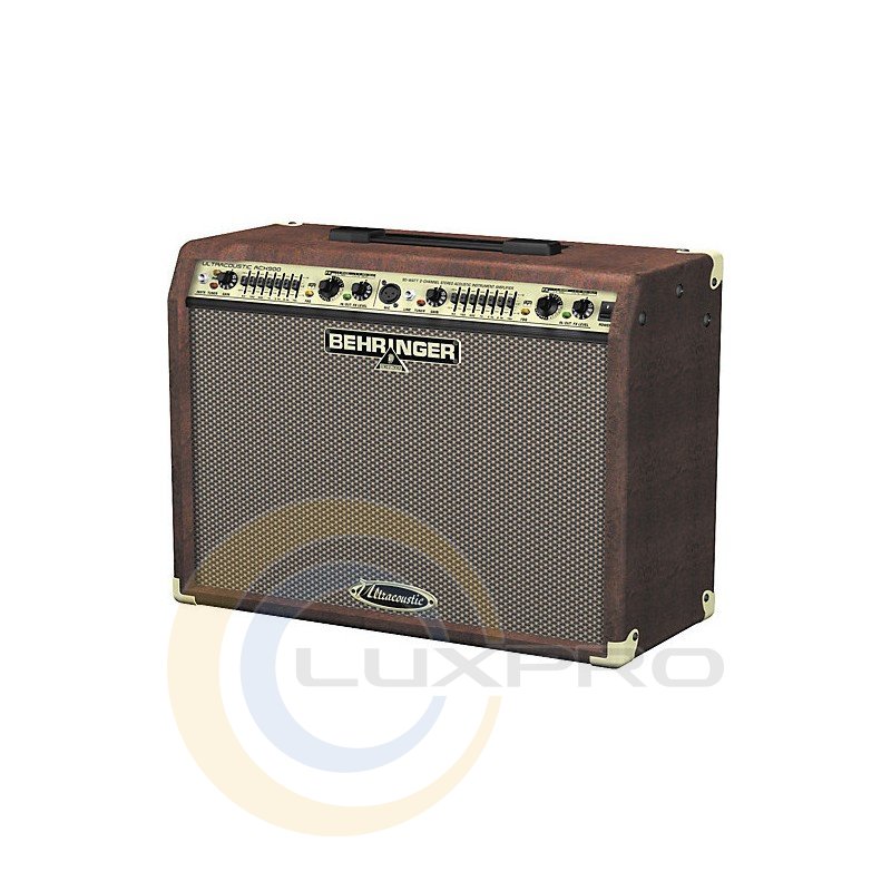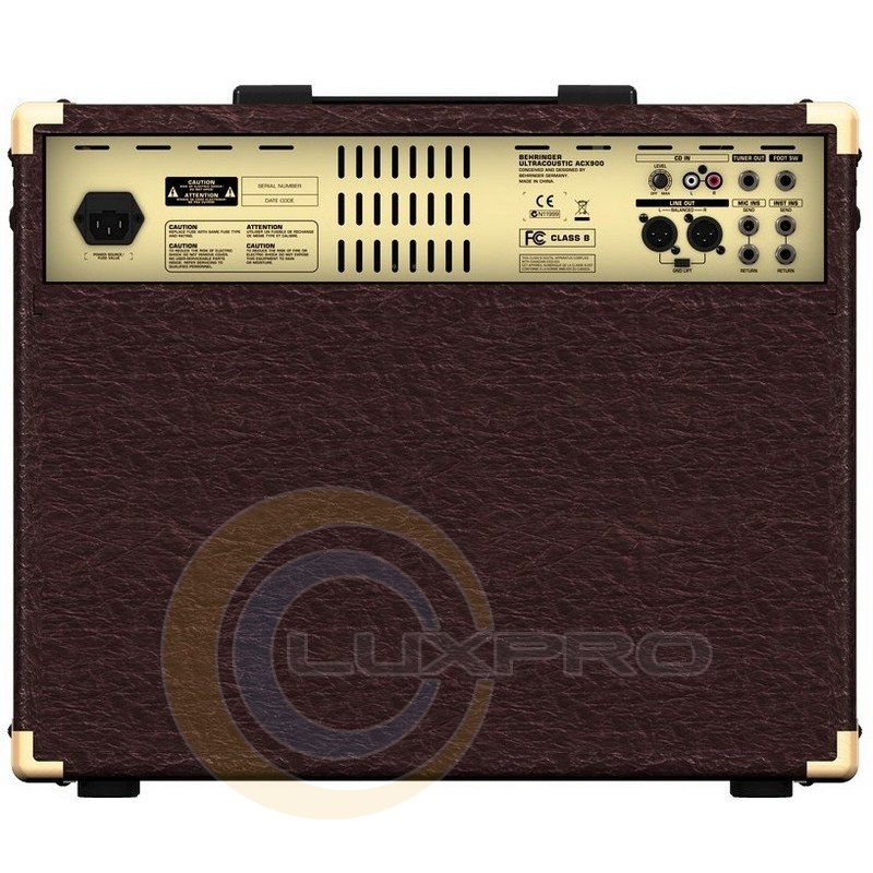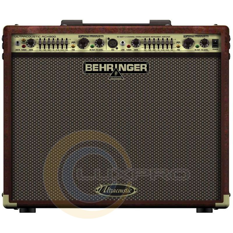 Потужність комбопідсилювача становить 90 Вт, яких цілком достатньо не тільки для моніторної подзвучки на сцені, а й для самостійних виступів в невеликих залах і клубах. Своє стереозвучание акустичний комбопідсилювач BEHRINGER ACX900 відтворює через два 8 '' динаміка BUGERA. 2 канали комбо дають можливість підключити гітару і мікрофон для сольного виступу. При цьому кожен канал має окремі регулювання настройки звучання. Роз'єми комутації розташовані на передній панелі.